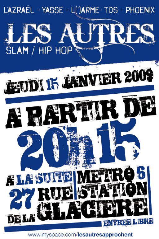 L’Azraël, Yasse, L(‘)Arme, TDS et Phoenix vous proposent une session slam / hip-hop, à partir de 20h15.